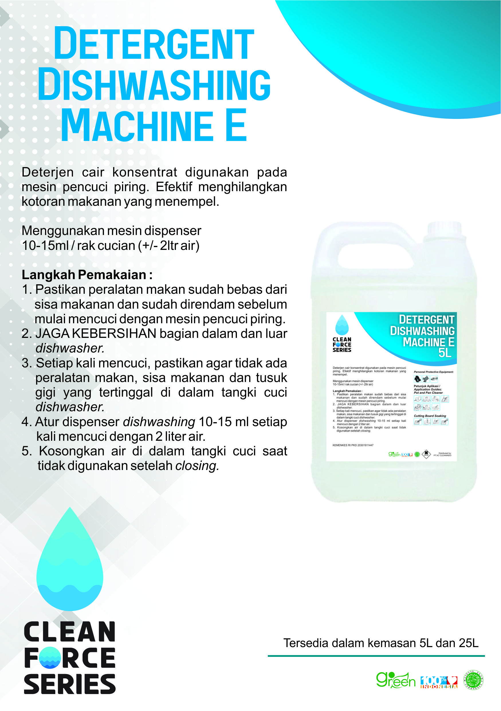 Deterjen cair konsentrat digunakan pada mesin pencuci piring. Efektif menghilangkan makanan yang menempel.