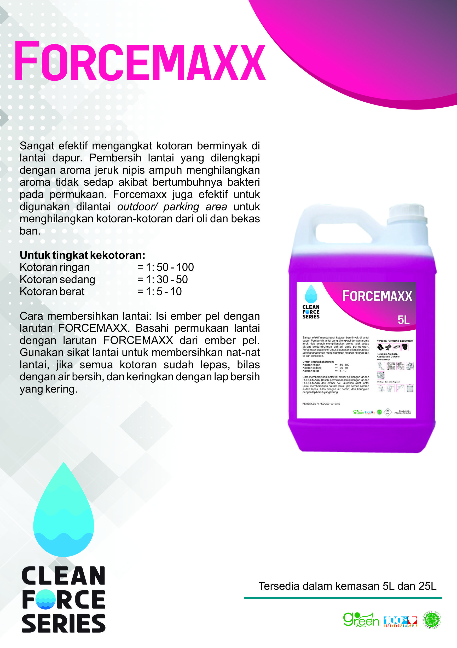 Sangat efektif mengangkat kotoran berminyak di lantai dapur. Pembersih lantai yang dilengkapi dengan aroma jeruk nipis ampuh menghilangkan aroma tidak sedap akibat bertumbuhnya bakteri pada permukaan. Forcemaxx juga efektif untuk digunakan di lantai outdoor/parking area untuk menghilangkan kotoran-kotoran dari oli dan bekas ban.