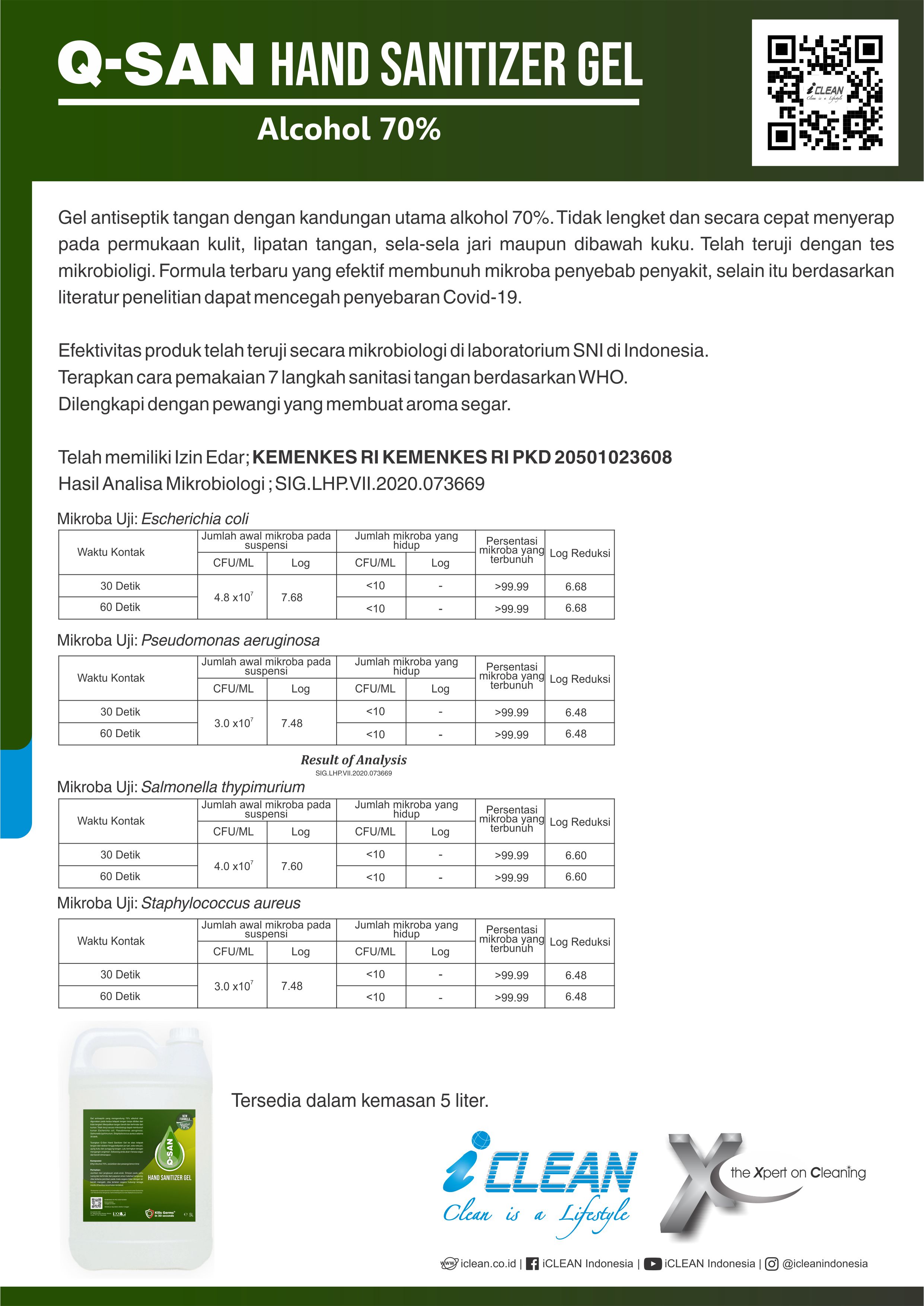 Hand Sanitizer digunakan setelah mencuci tangan dengan sabun cuci tangan anti bakteri untuk menghindari keracunan makanan yang disebabkan oleh bakteria. Sangat direkomendasi untuk pegawai industri makanan & minuman, pelayanan yang kontak dengan makanan dan rumah sakit. Dengan formulasi produk yang efektif untuk menghilangkan organisme patogen misalnya E. Coli, S. Aureus dll.