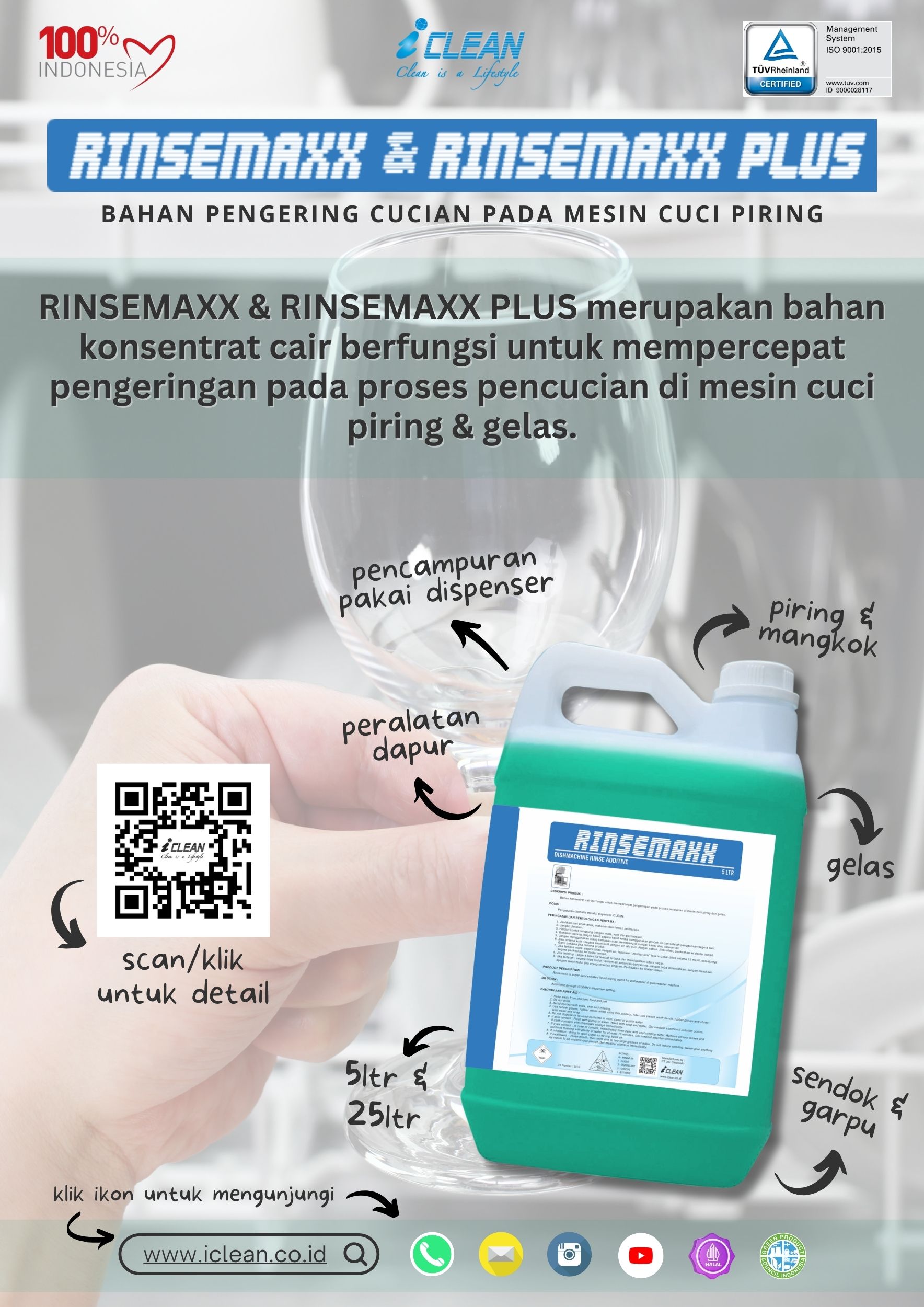 RINSEMAXX & RINSEMAXX PLUS merupakan bahan konsentrat cair berfungsi untuk mempercepat pengeringan pada proses pencucian di mesin cuci piring & gelas.