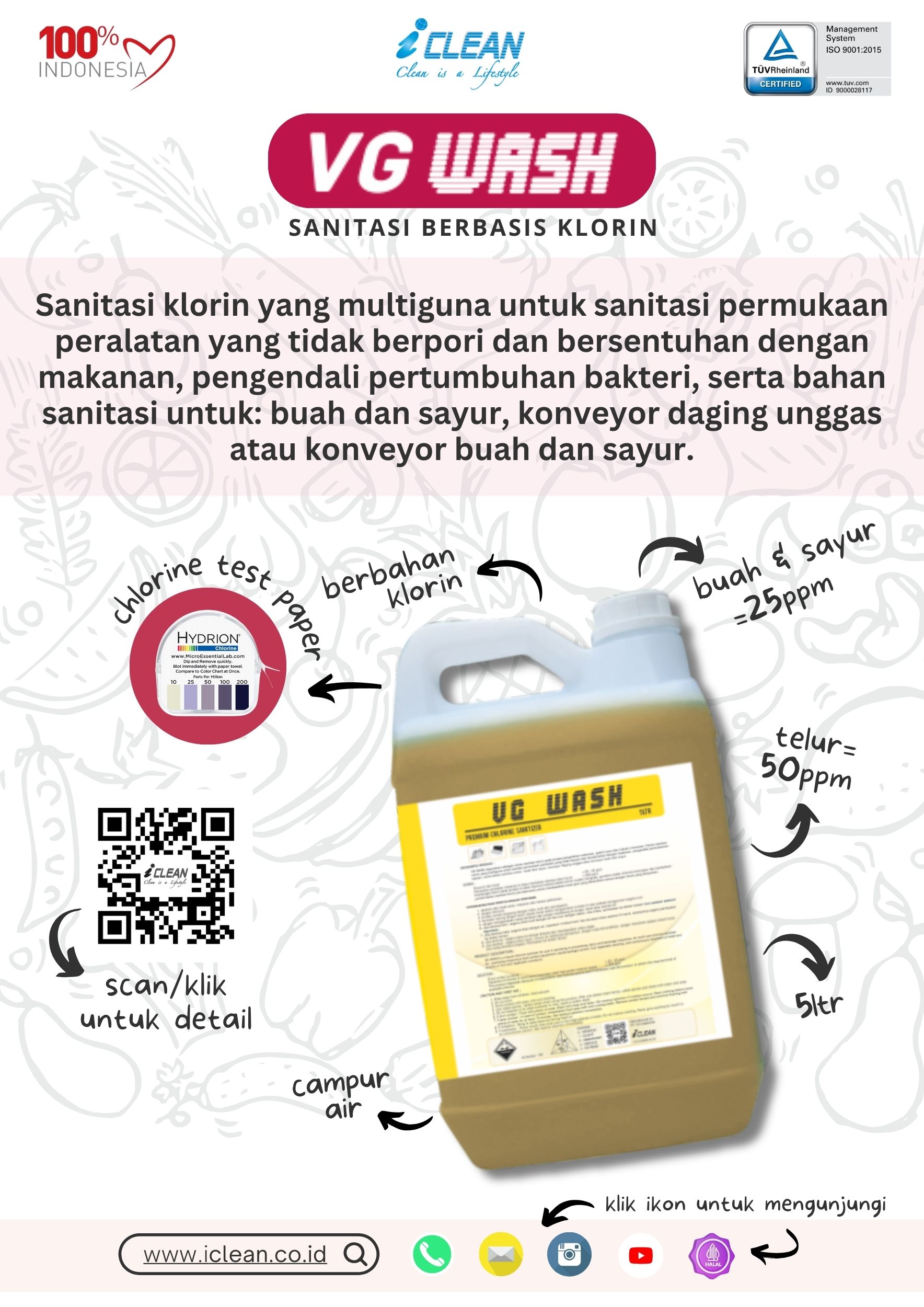 VG WASH digunakan sebagai cairan sanitasi klorin pada proses pengolahan makanan, pabrik susu & industri minuman. Cairan sanitasi klorin yang multiguna untuk sanitasi permukaan peralatan yang tidak berpori & bersentuhan dengan makanan, pengendali pertumbuhan bakteri, serta bahan sanitasi untuk buah & sayur, konveyor daging unggas atau konveyor buah & sayur.