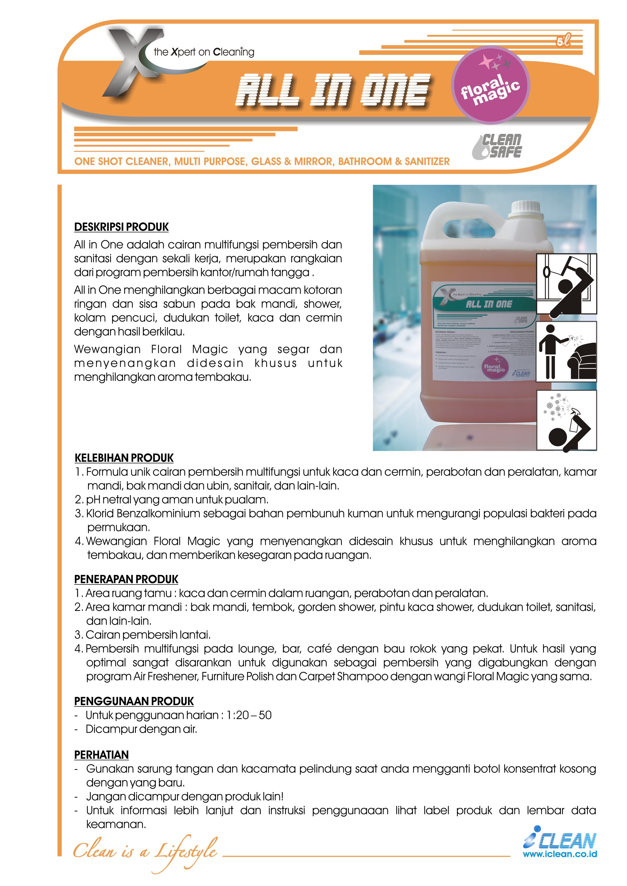 Pembersih serba guna sekaligus mensanitasi, dan merupakan bagian dari program housekeeping. Membersihkan kotoran ringan dan residu sabun pada bath tub showers, wash basin, toilet bowl, kaca dan cermin tanpa meninggalkan bekas. Produk ini mengandung Benzalkonium Chloride sebagai anti-bacterial. Untuk hasil maksimal, gunakan produk yang terintegrasi yakni Air Frezz, Furniture Care & Carpet Care dengan aroma yang sama.