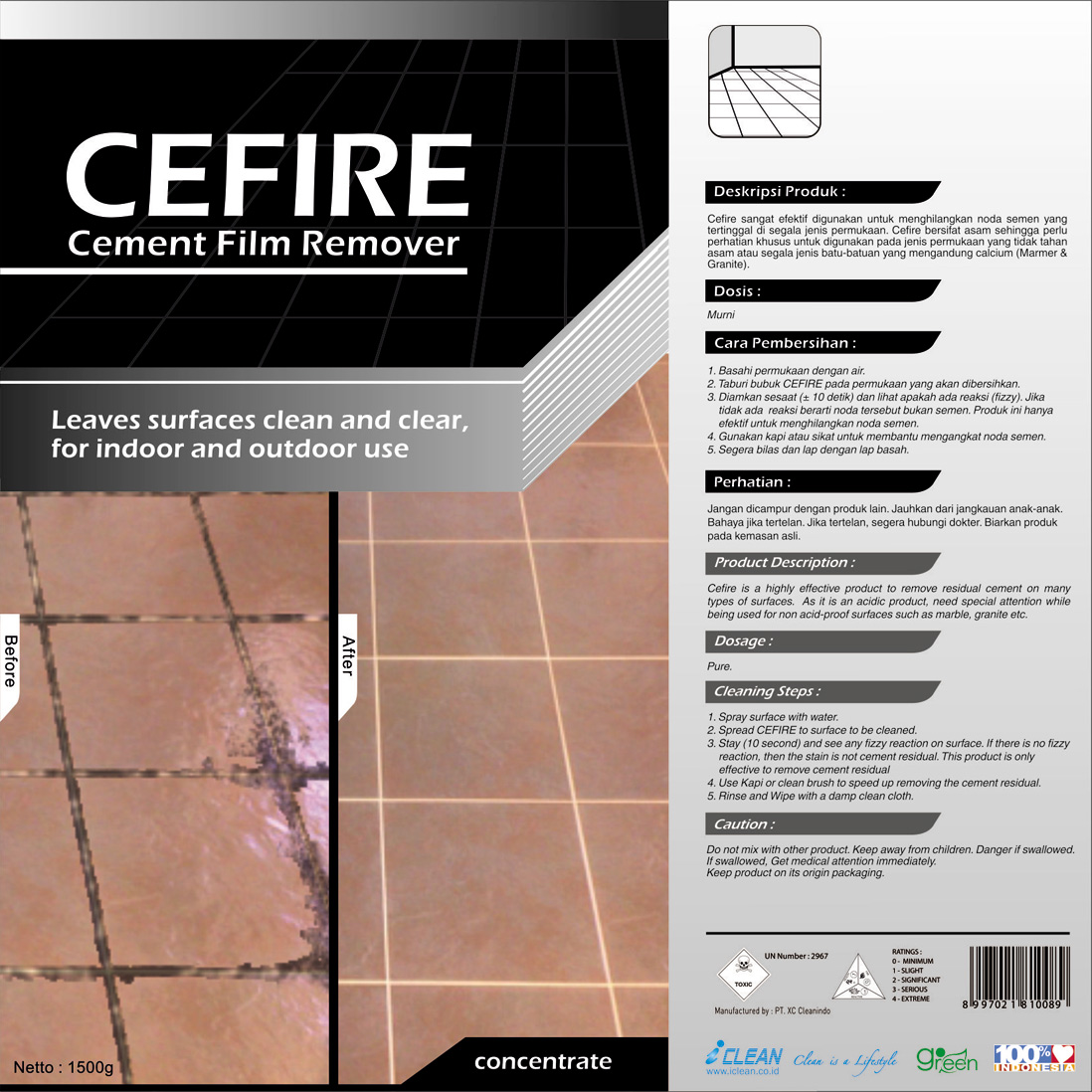 CEFIRE di desain untuk menghilangkan noda semen yang tertinggal di permukaan batu yang tahan terhadap acid. Komposisi produk akan menghilangkan noda semen secara menyeluruh. Produk ini juga dapat menghilangkan noda skala ubin setelah ubin dipasang.