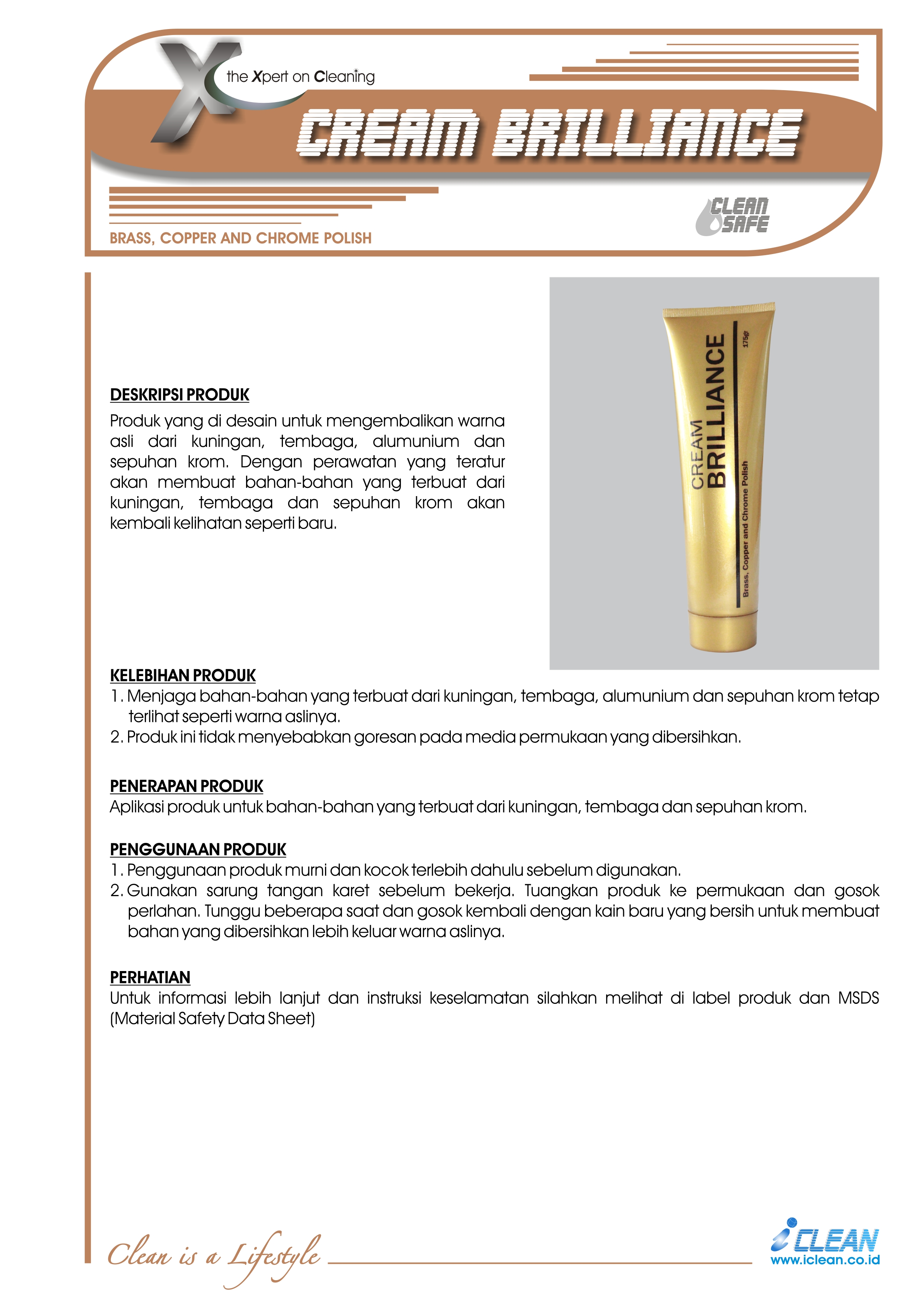 Pembersihan secara teratur dengan Cream Brilliance akan kembali mengkilapkan kuningan, tembaga dan krom. Dirancang untuk mengembalikan tembaga, kuningan dan krom mengkilap kembali. Penggunaan perawatan yang rutin berkala dapat memperbaharui setiap tembaga kuningan dan krom serta tidak akan meninggalkan bekas goresan.