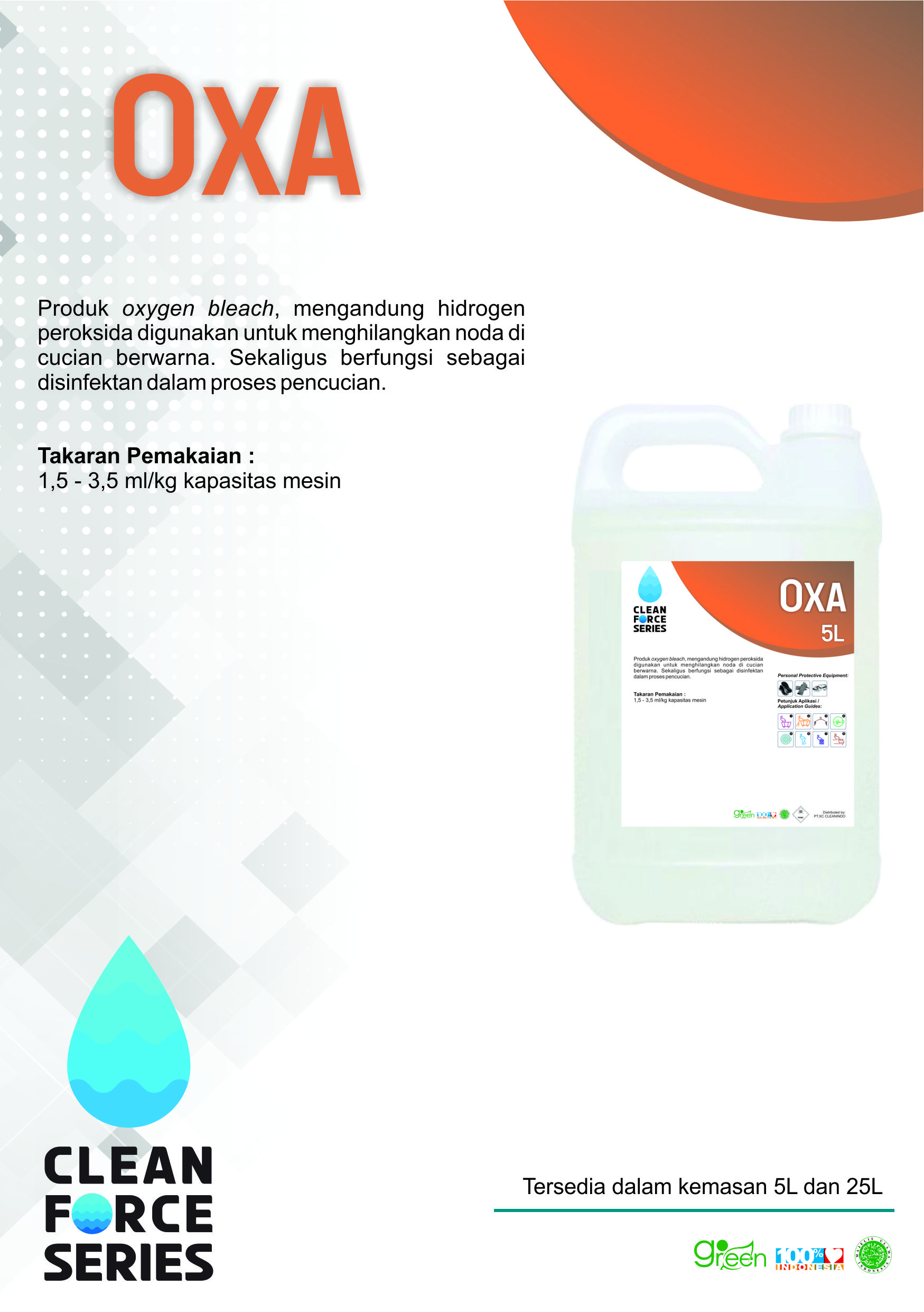 Produk oxygen bleach, mengandung hidrogen peroksida digunakan untuk menghilangkan noda di cucian berwarna. Sekaligus berfungsi sebagai disinfektan dalam proses pencucian.