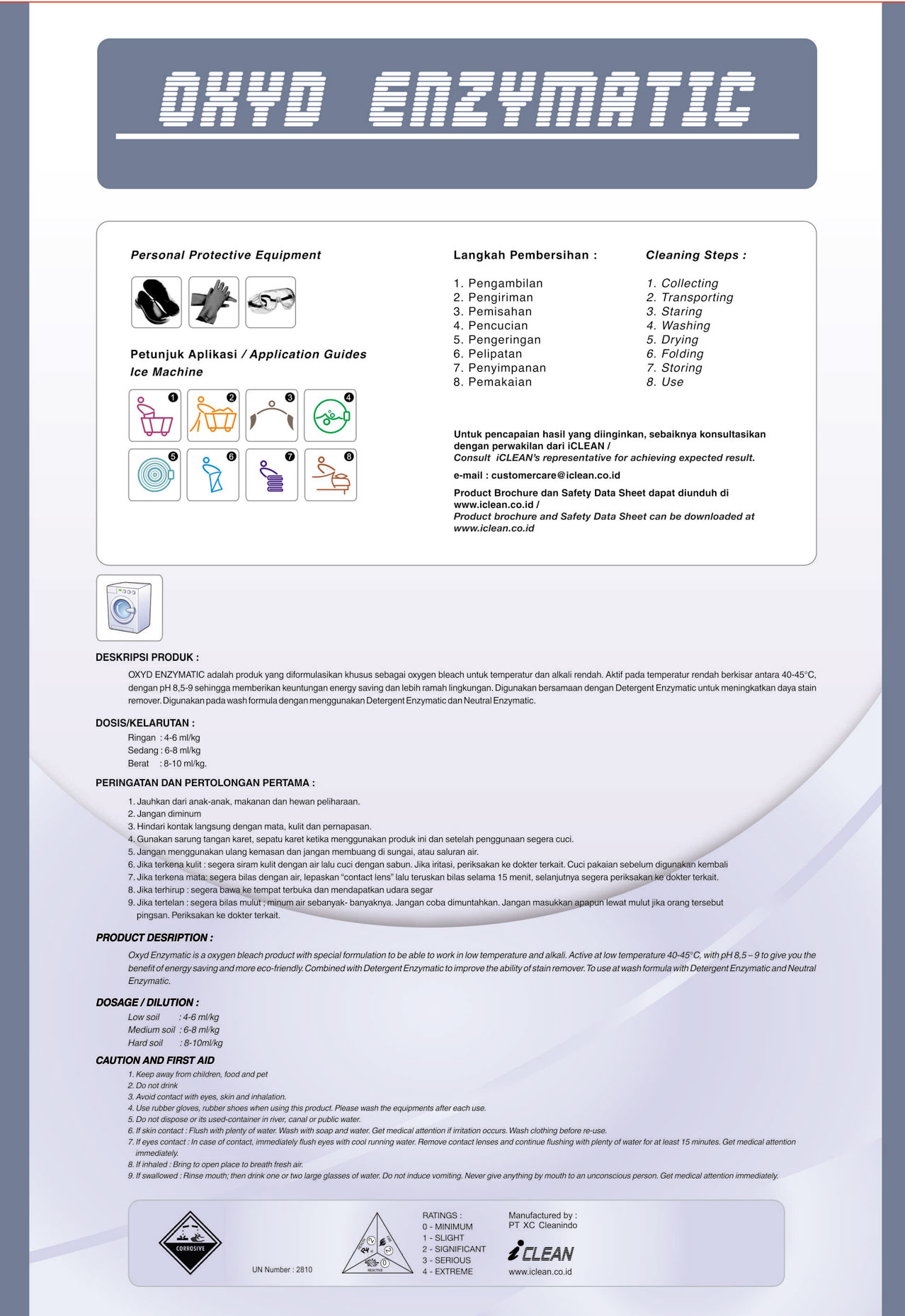 OXYD ENZYMATIC adalah produk yang diformulasikan khusus sebagai oxygen bleach untuk temperatur dan alkali rendah. Aktif pada temperatur rendah berkisar antara 40 – 45°C, dengan pH 8,5 – 9 sehingga memberikan keuntungan energy saving dan lebih ramah lingkungan. Digunakan pada wash formula dengan menggunakan DETERGENT ENZYMATIC dan NEUTRAL ENZYMATIC.