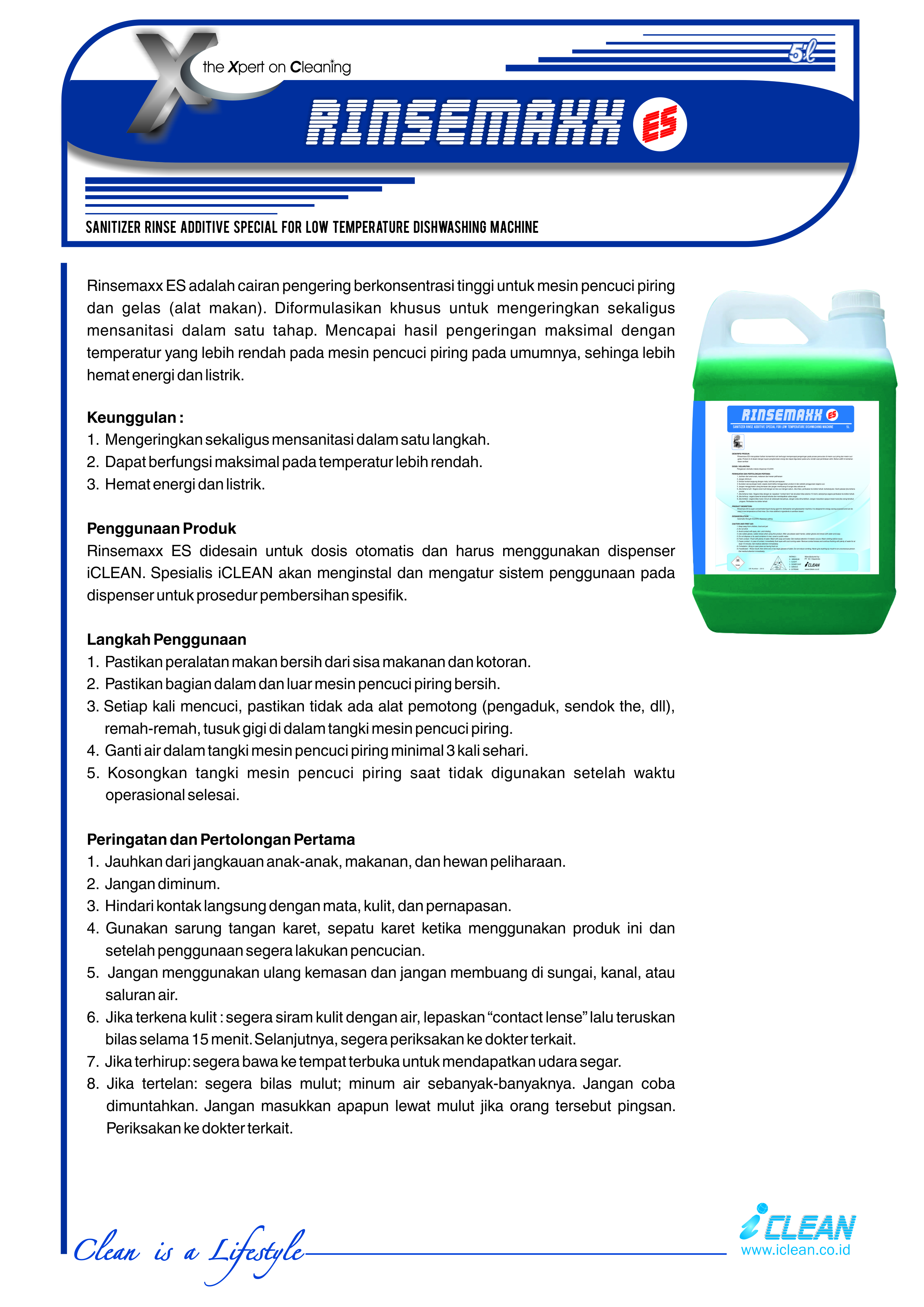 Rinsemaxx ES is super concentrated liquid drying agent for dishwasher and glasswasher machine. It is designed for energy saving purposed and can be used in low temperature at final rinse. Our rinse additive’s ingredients is sanitizer based.