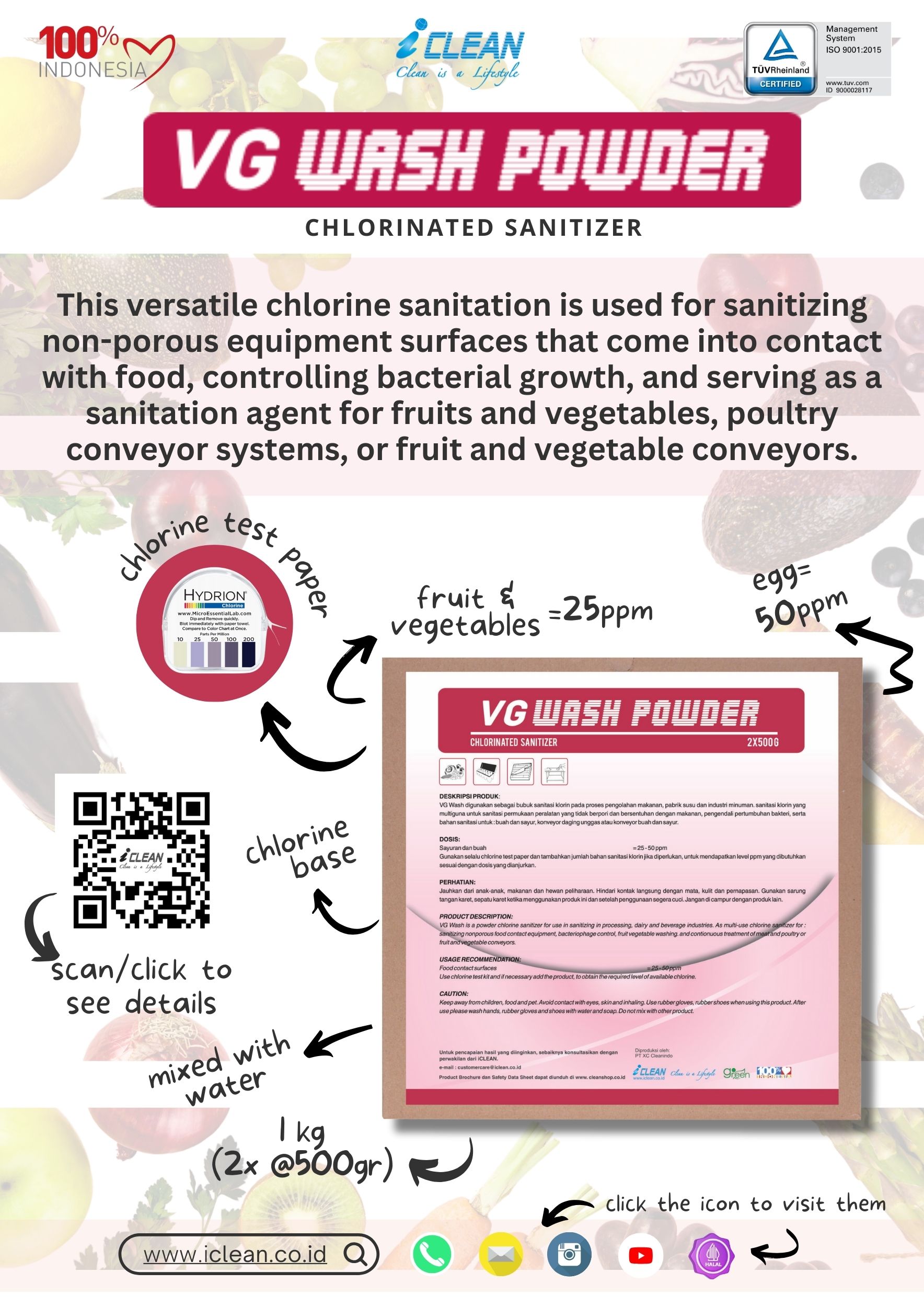 VG Wash is used as a chlorine sanitation powder in the food processing, dairy, and beverage industries. This versatile chlorine sanitation is used for sanitizing non-porous equipment surfaces that come into contact with food, controlling bacterial growth, and serving as a sanitation agent for fruits and vegetables, poultry conveyor systems, or fruit and vegetable conveyors.