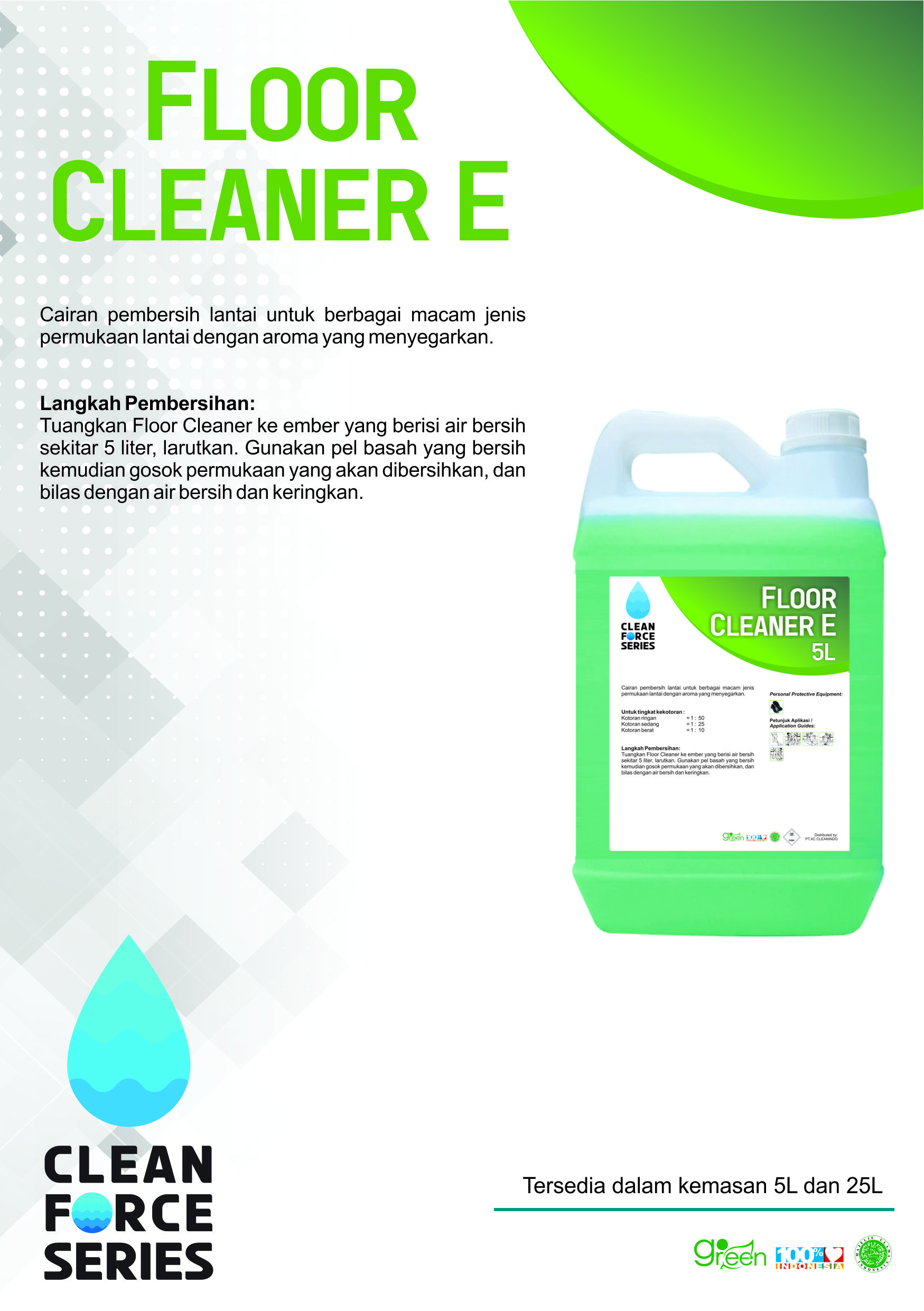 Tuangkan Floor Cleaner ke ember yang berisi air bersih sekitar 5 liter, larutkan. Gunakan pel basah yang bersih, kemudian gosok permukaan yang akan dibersihkan, dan bilas dengan air bersih dan keringkan.