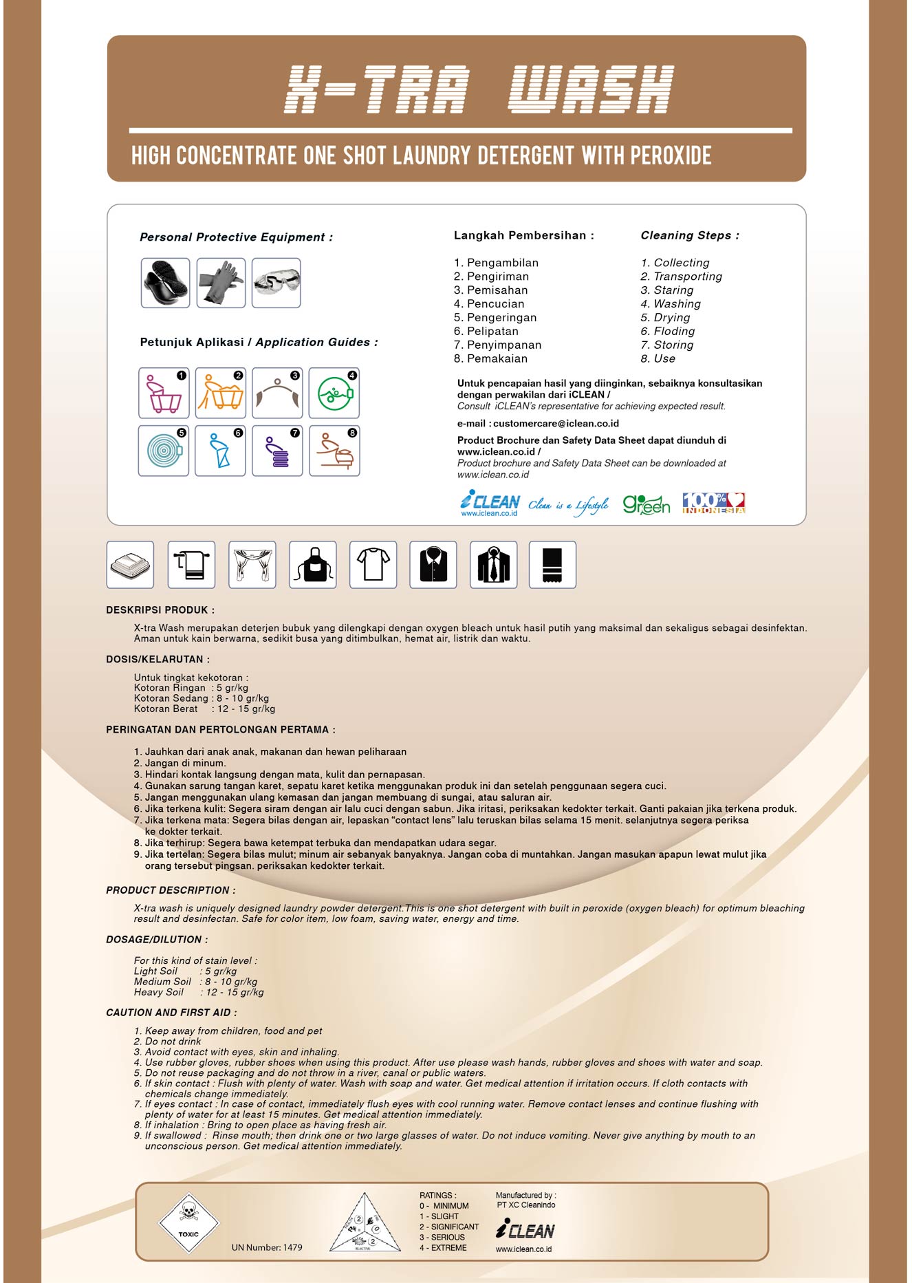 X-TRA WASH is uniquely designed laundry powder detergent. This is one shot detergent with built in peroxide (oxygen bleach) for optimum bleaching result disinfectan. Safe for color item, low foam, saving water, energy and time.